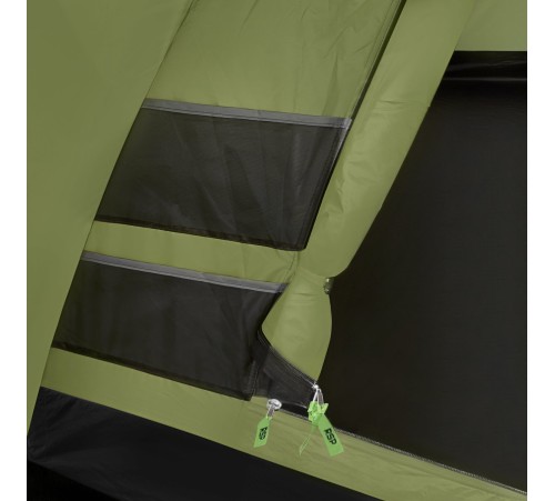 Молнии и бегунки в палатке очень высокого качества, на бегунках установлены тканевые пуллеры салатового цвета, благодаря им открывать и закрывать дверь на много удобнее, а в темное время суток проще найти бегунок.